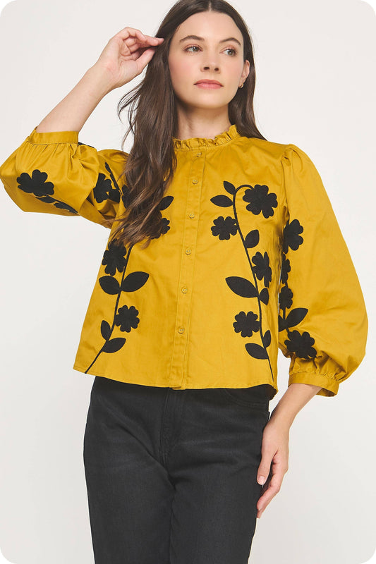 3/4 Sleeve Flower Embroidery Ruffle Neck Shirt