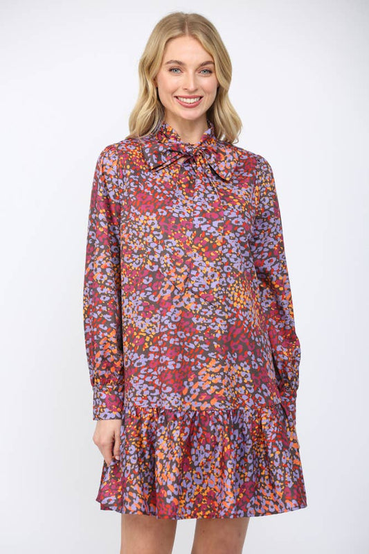 ABSTRACT ANIMAL PRINT TIE NECKLINE RUFFLE HEM DRESS