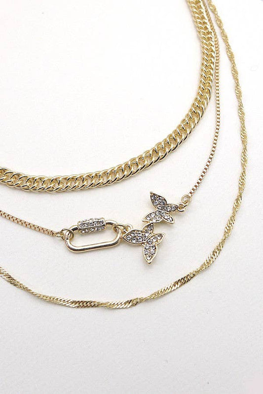 RHINESTONE BUTTERFLY LOCK MULTI CHAIN NECKLACE