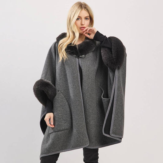 Faux Fur Trim Toggle Clasp Front Cape Wrap Poncho