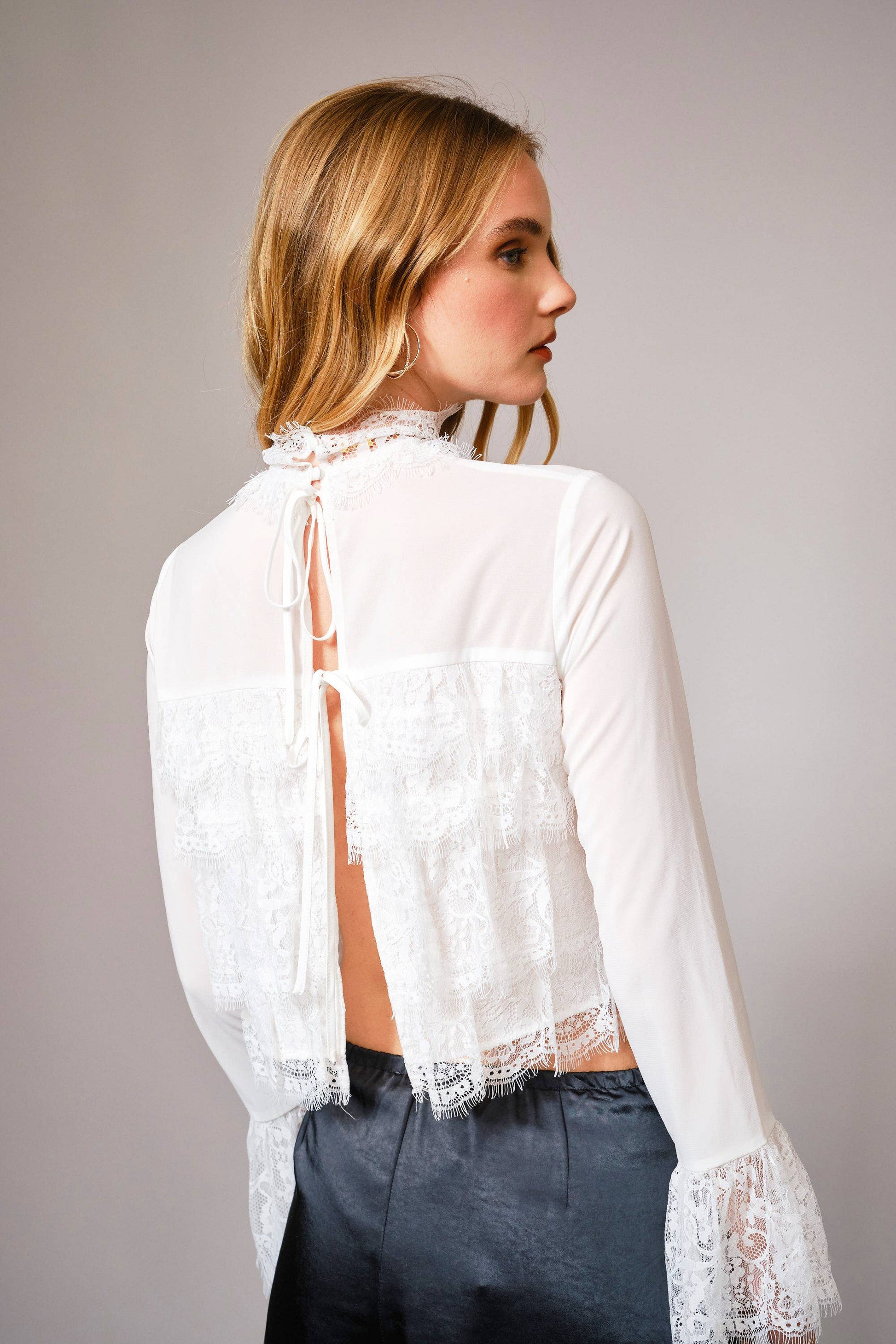 Romantic lace crop top with mock neck, tiered lace body, and bell sleeves. Sheer back with tie closures.