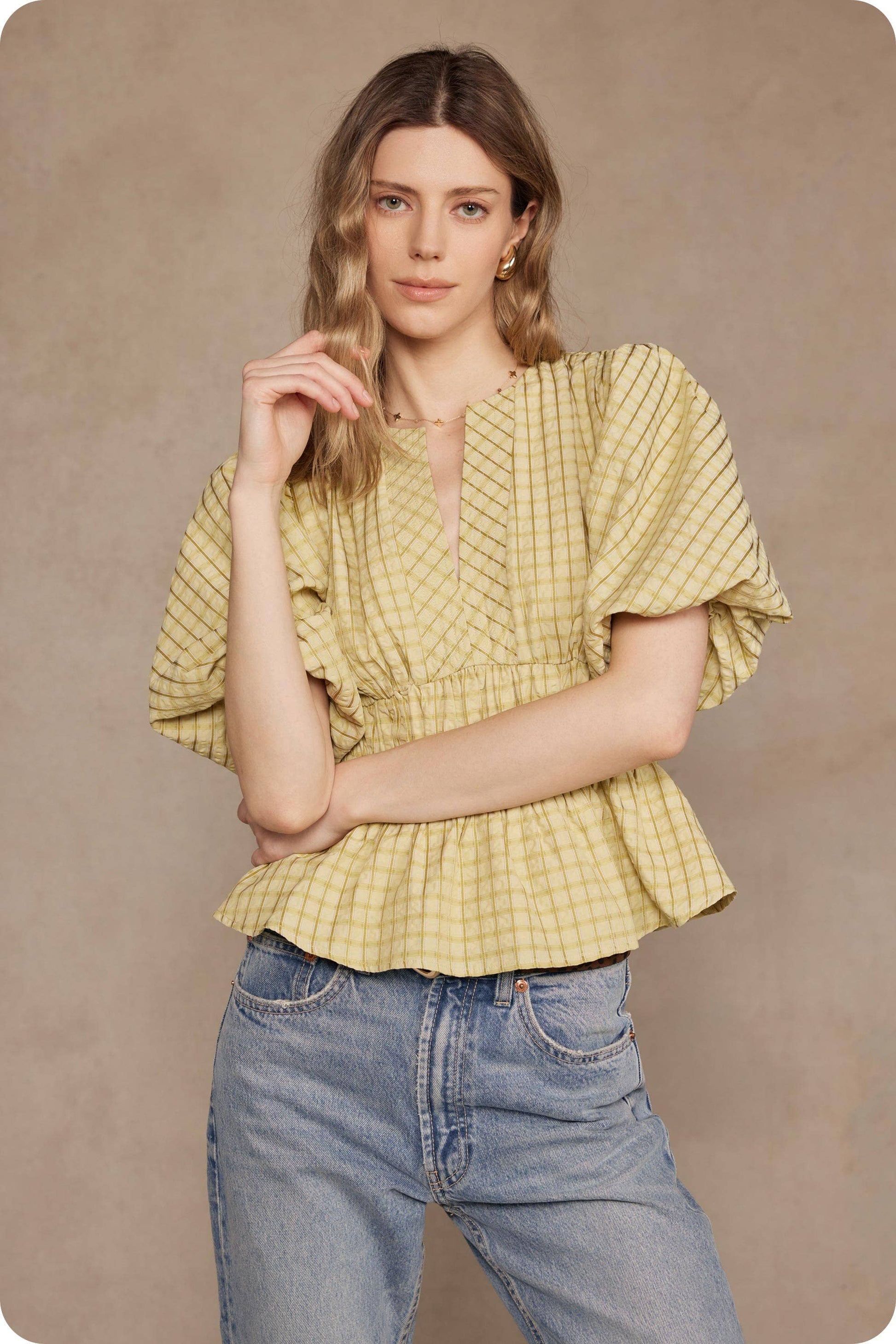 Studio Strut and Bolt Collection. Puff Sleeve blouse in windowpane check print on textured woven fabric. This top features a split V neckline with fused panel, puff short sleeves, cinched elasticated waist, shirred shoulders, and peplum hem.