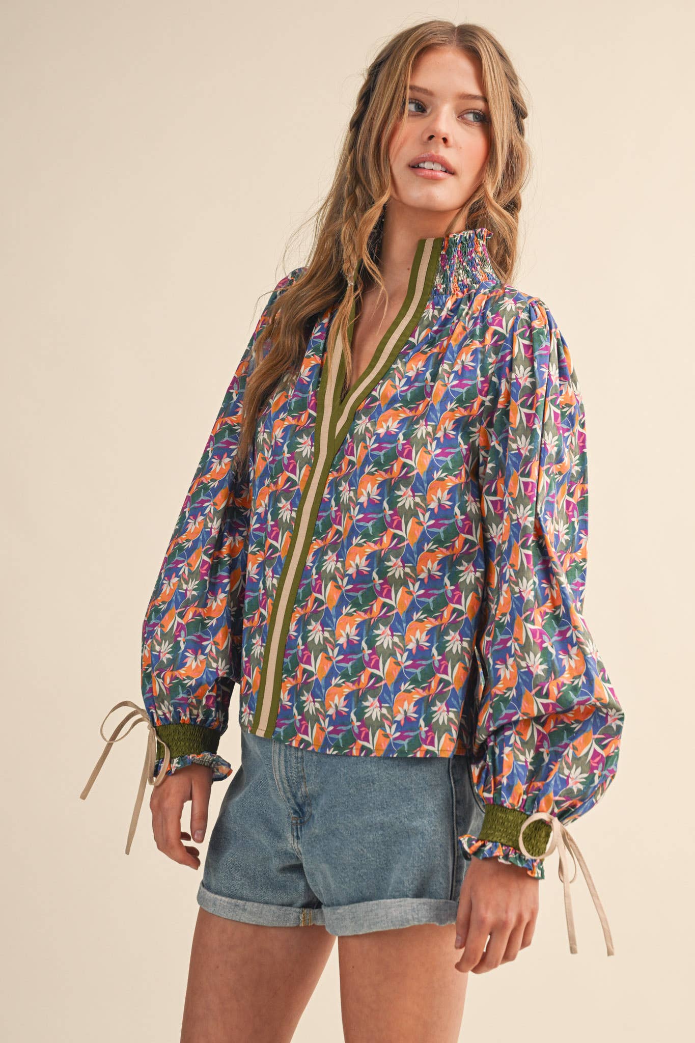 CONTRAST SMOCKED PUFF SLEEVE TOP