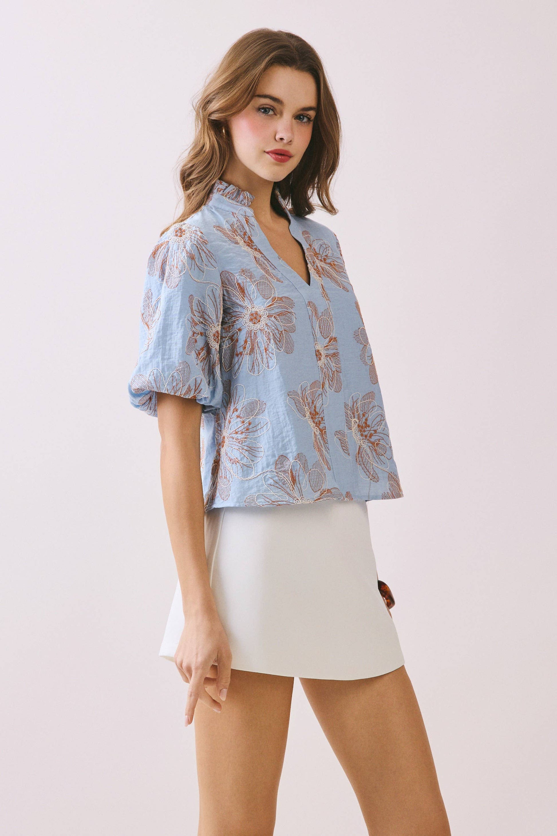A lightweight embroidered top featuring oversized floral detailing, a ruffled split neckline, and soft puff sleeves. Designed with a relaxed and easy fit.