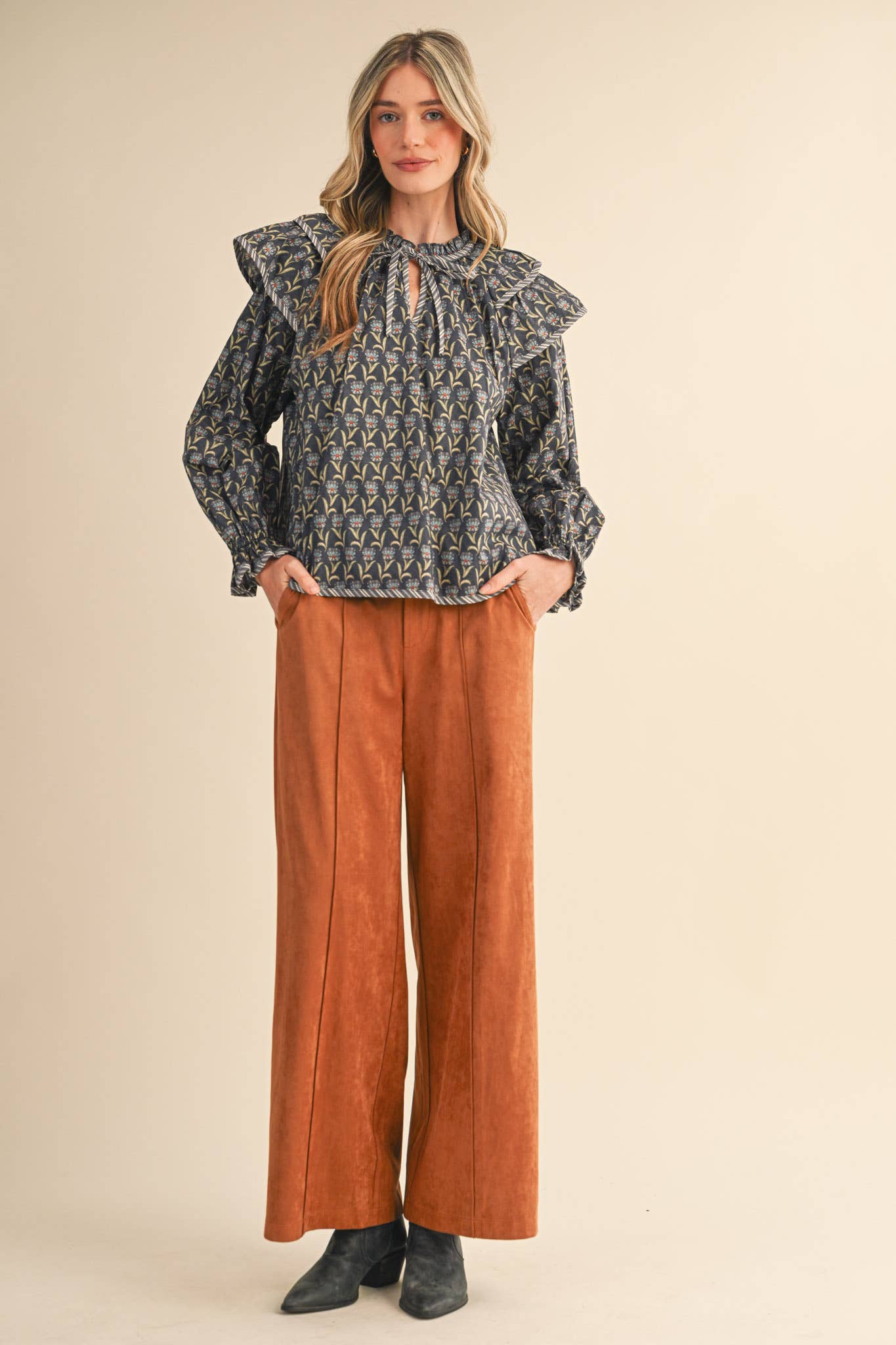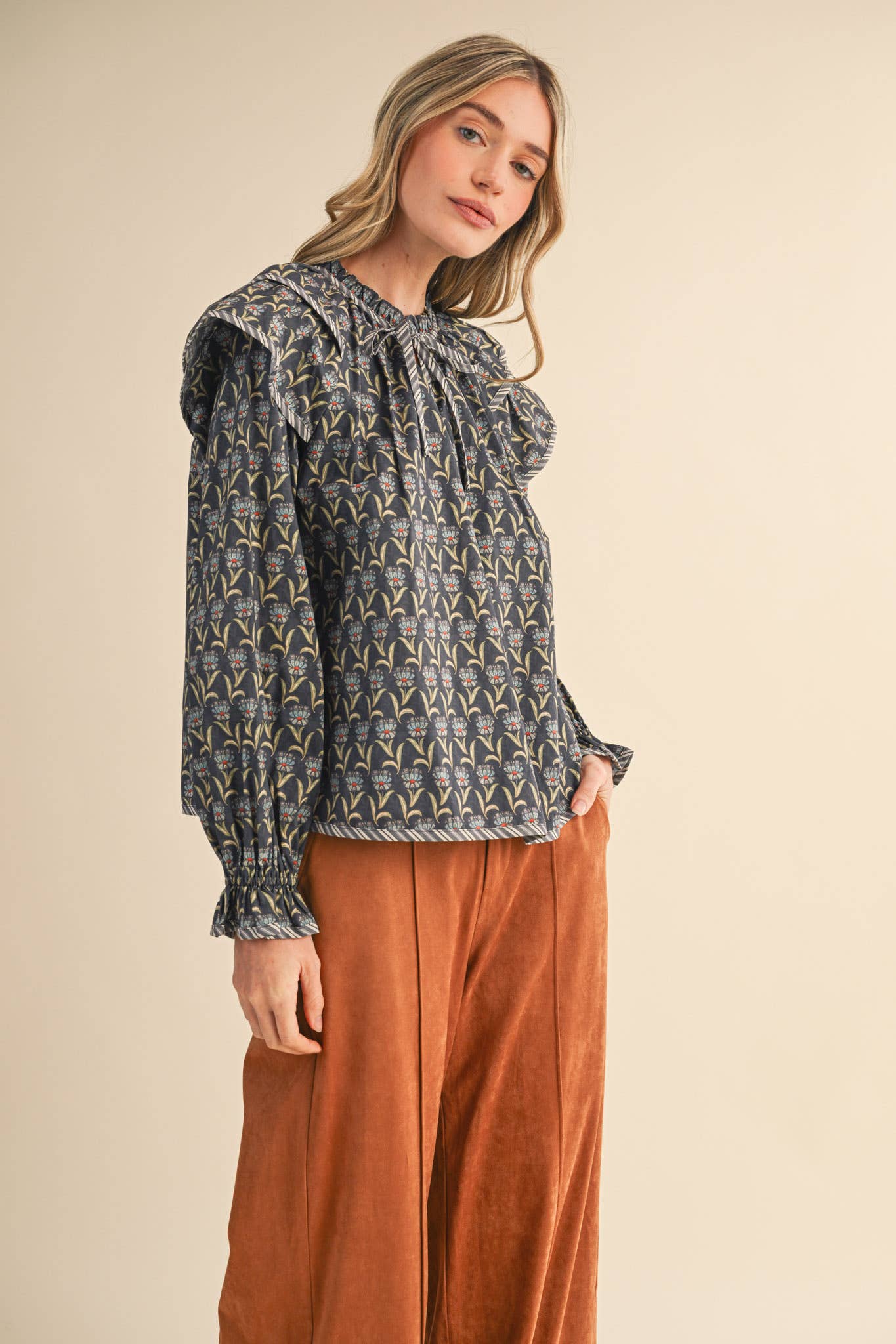 + Long puff sleeves with elastic ruffled cuffs