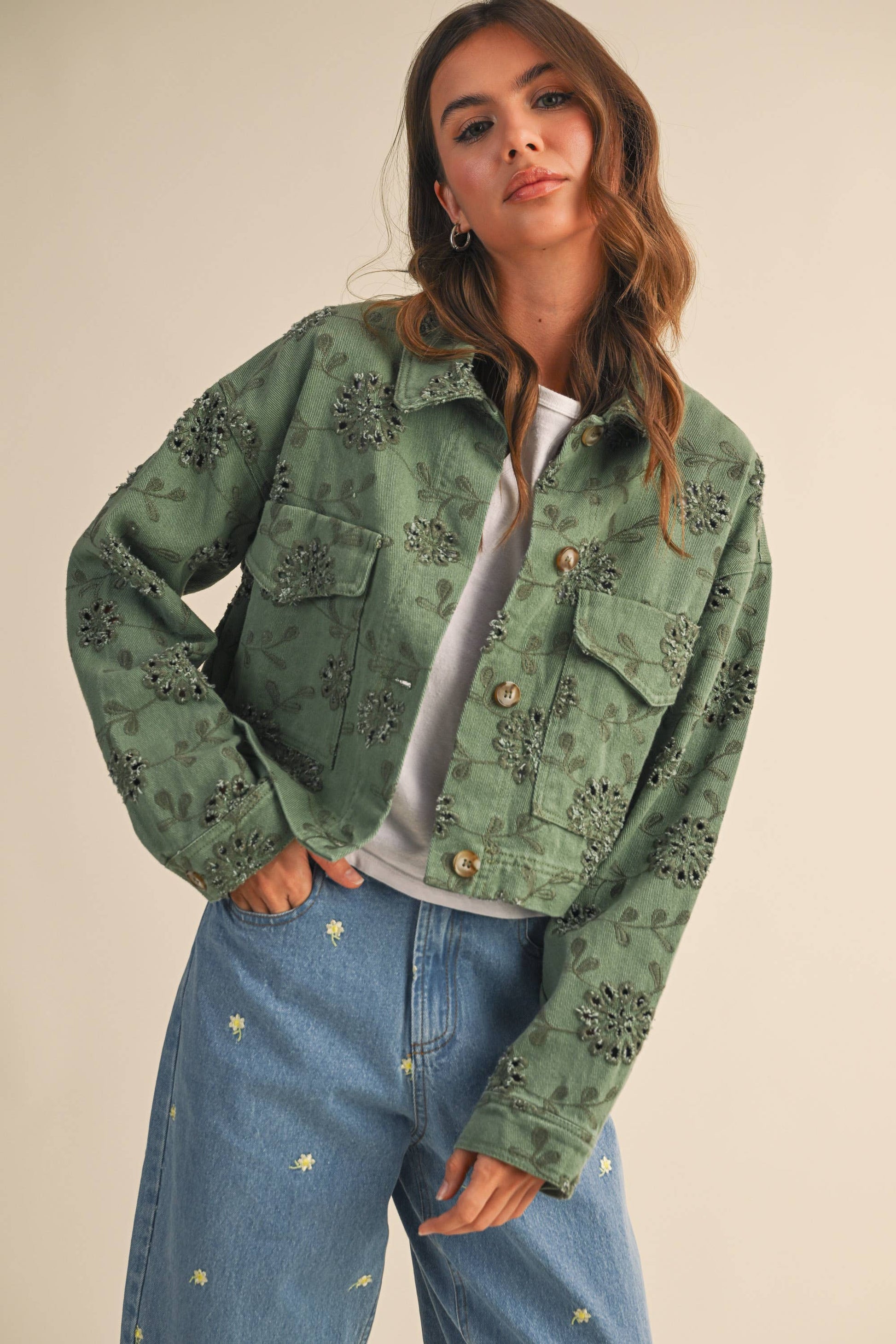Introducing the IJ1588 Eyelet Twill Cropped Trucker Jacket from Klesis. This 100% cotton jacket is a unique piece that combines comfort and style. The cropped length adds a modern touch to the trucker jacket design, and the eyelet twill fabric enhances its overall look. This jacket is a testament to our commitment to quality and trend-setting designs. Wear it over your favorite outfit for an added layer of style.