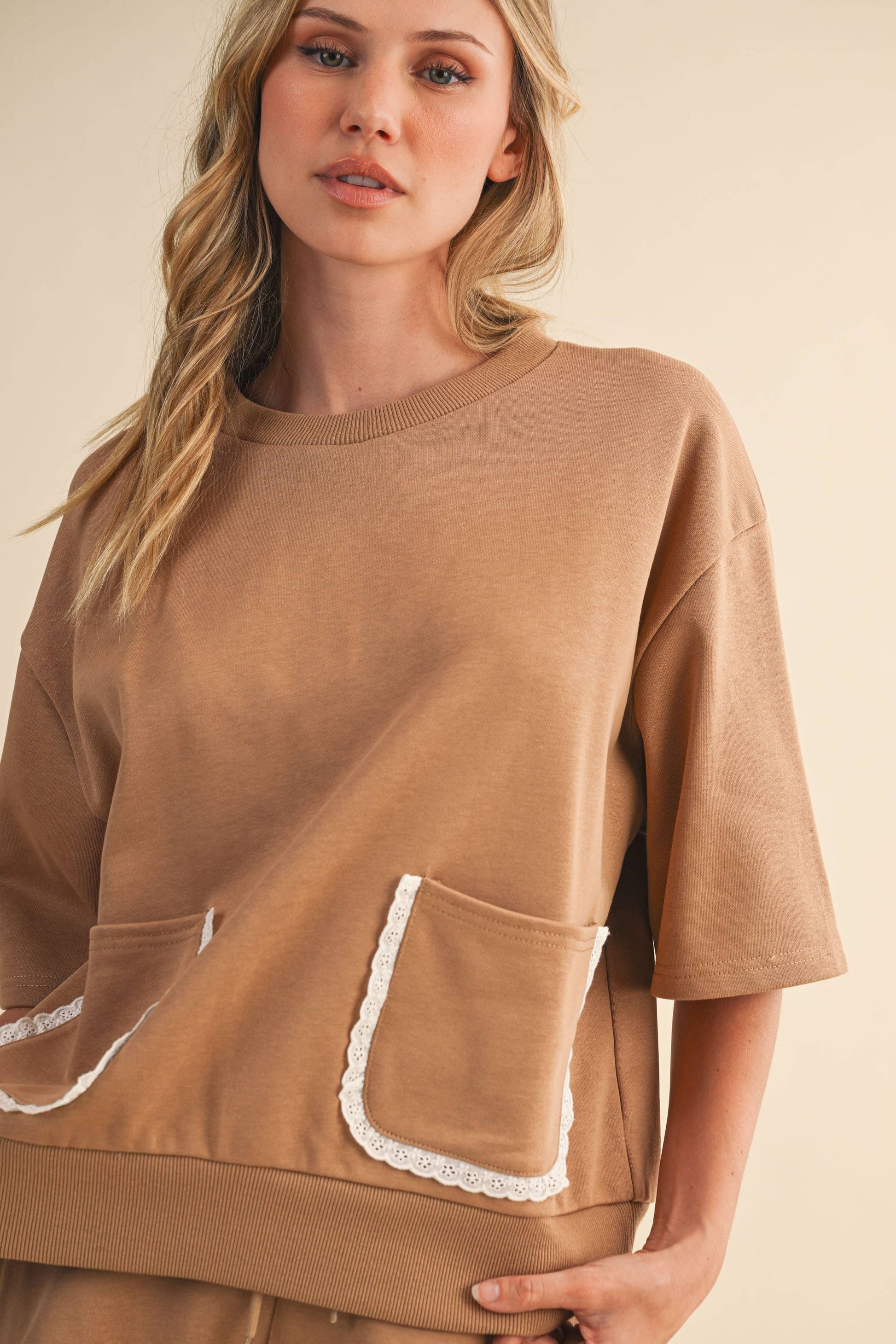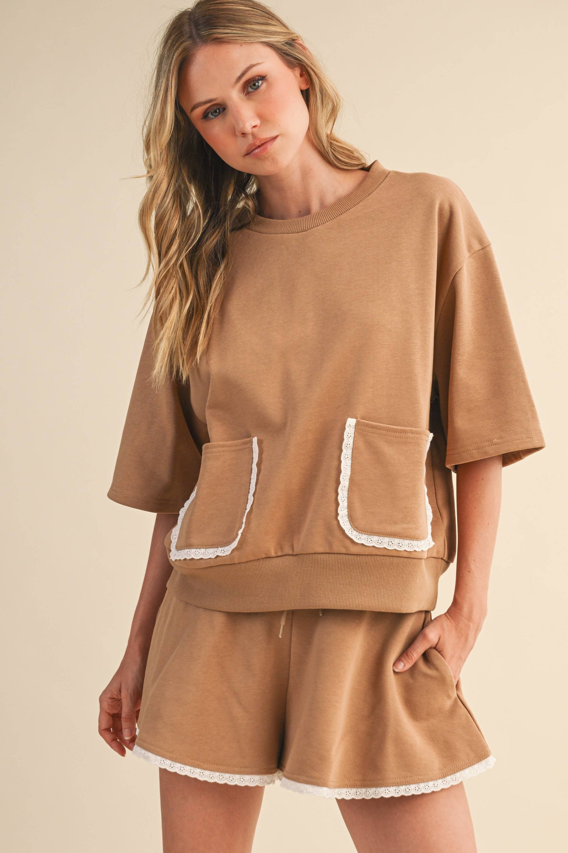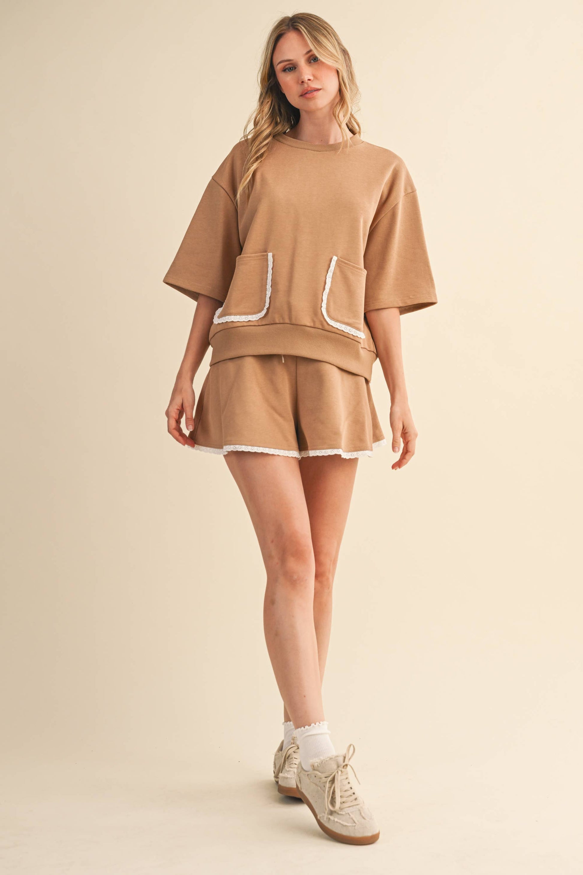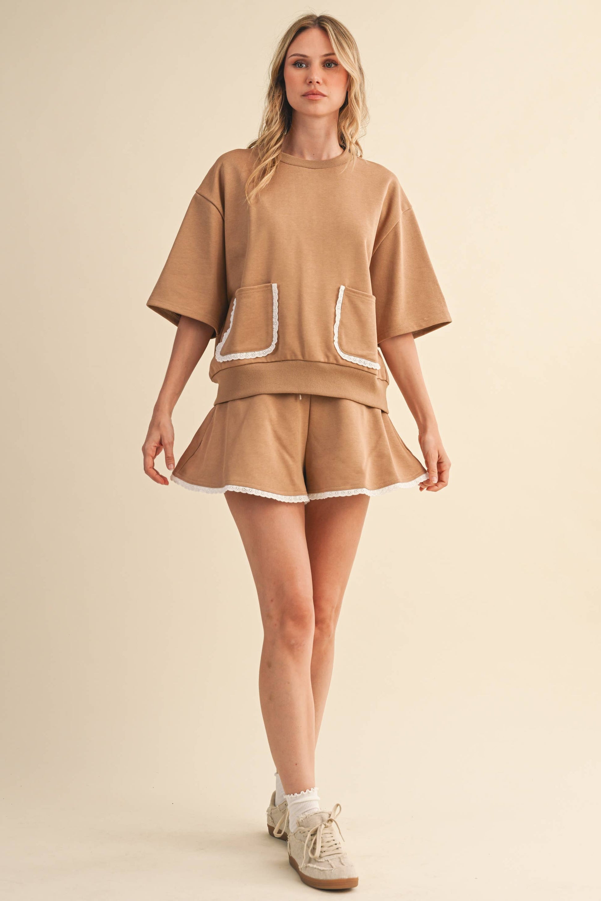EYELET LACE DETAILED SHORT SLEEVE SWEATSHIRT AND FLARE SHORTS