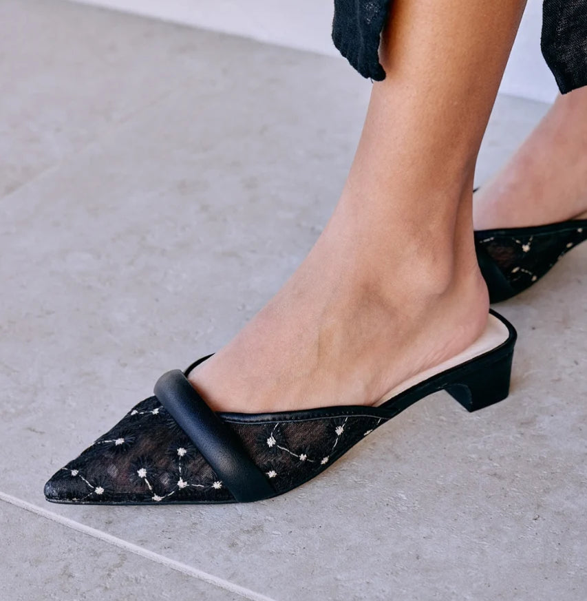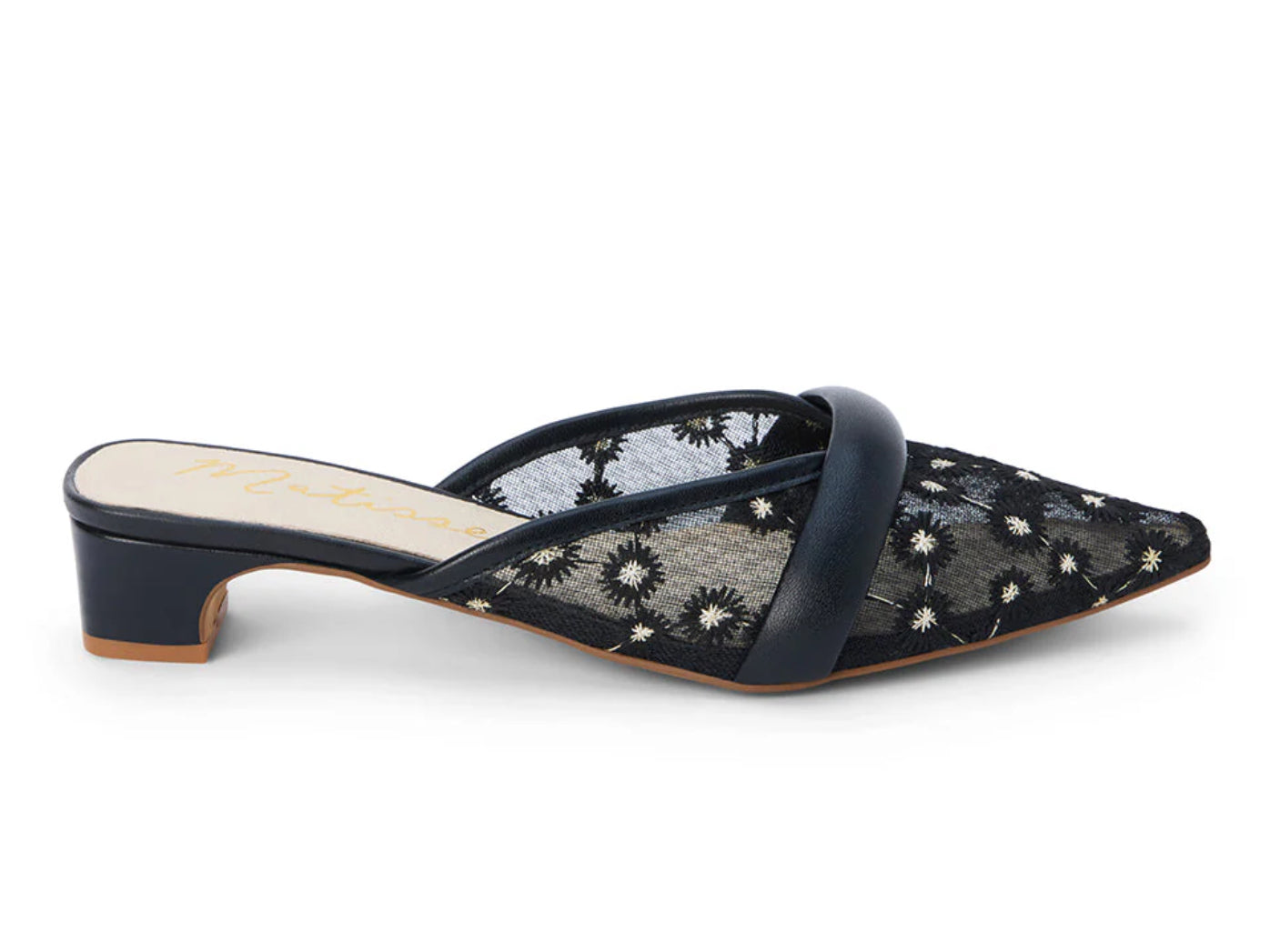 Mixed material kitten heel with a pointed toe.