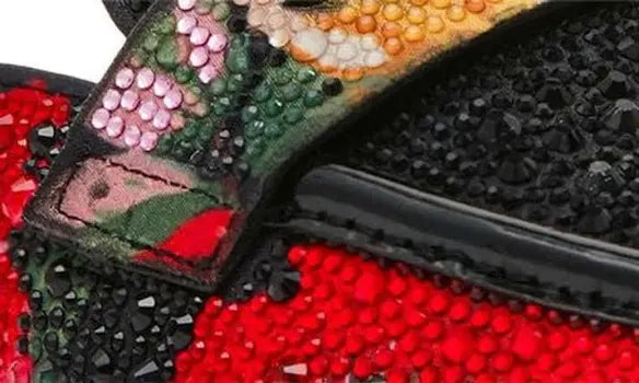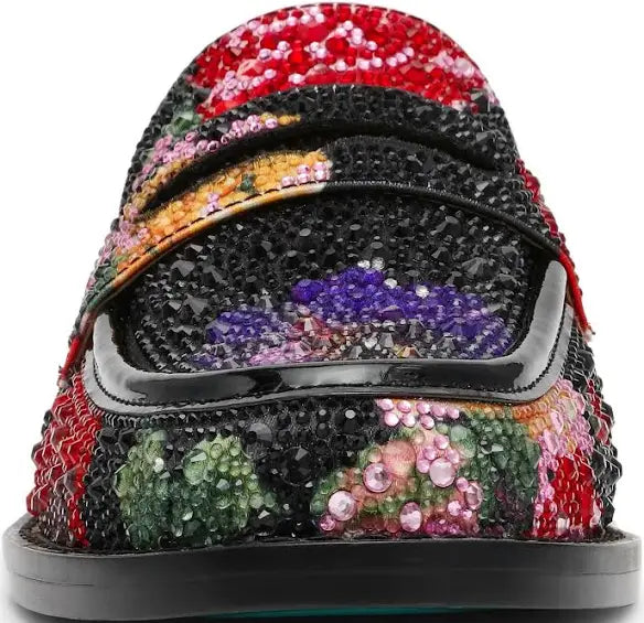 A classic loafer takes a bold, glamorous turn with an allover floral pattern and penny-keeper embellishment covered in sparkling rhinestones.