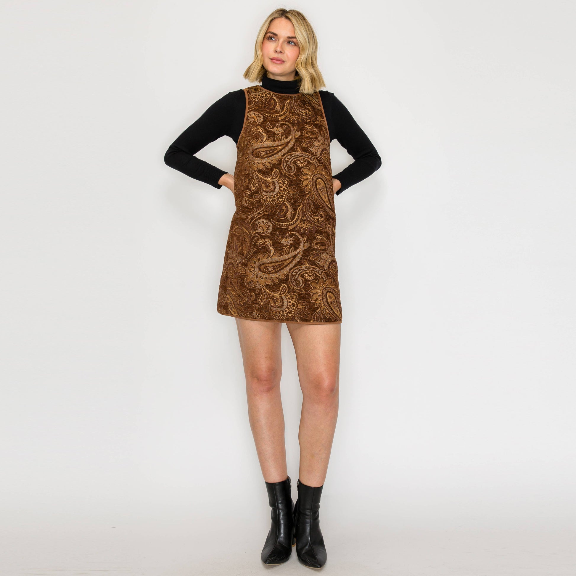 - Vintage vive Brown & taupe color combo - Fall Dress - As shown in the photo, if you style it with a turtleneck sweater underneath, it makes a great fall/winter dress - Camel suede binding detail on neck line, arm hole and bottom hem - Sleeveless simple shift dress - Back key hole with button - Good layering with simple shirts or blouse inner
