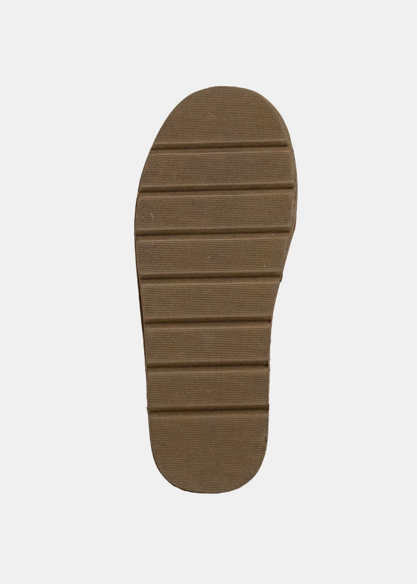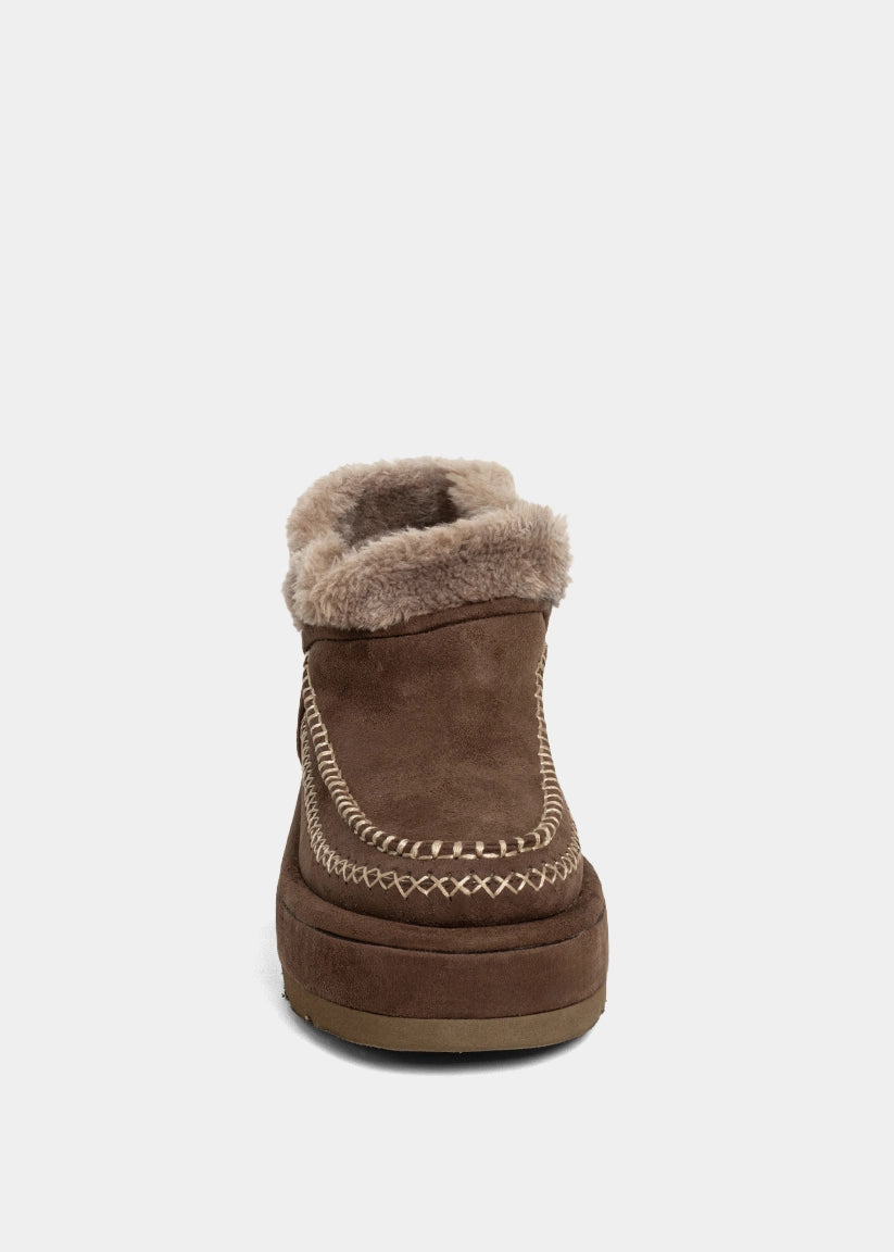 Upper: Faux suede in taupe with decorative whipstitch trim